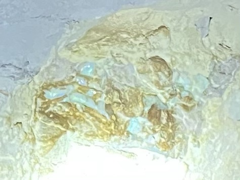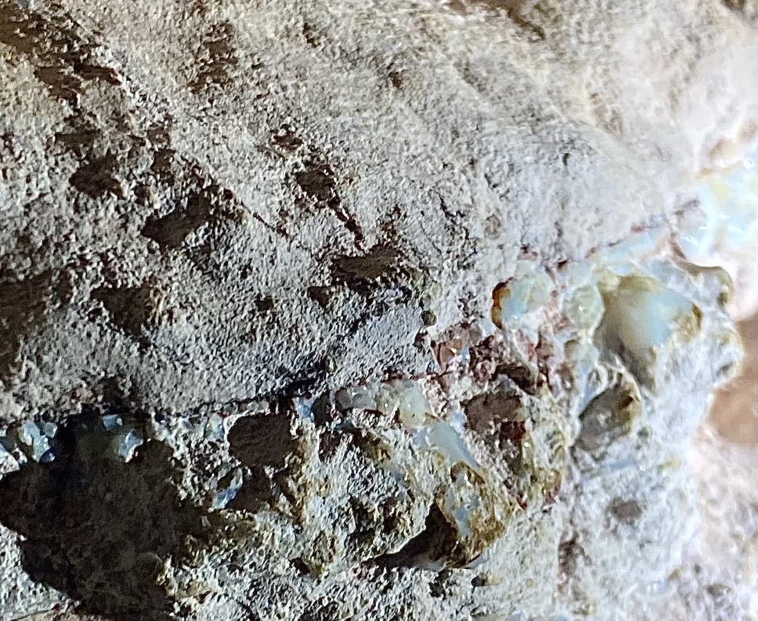 The environment changed again, rain disappeared and the long, hot rainless days began. Again the water was evaporated as the clay dried out. Water leeched out of the silica filled voids and hardened into many different minerals two of interest here are potch and Opal.