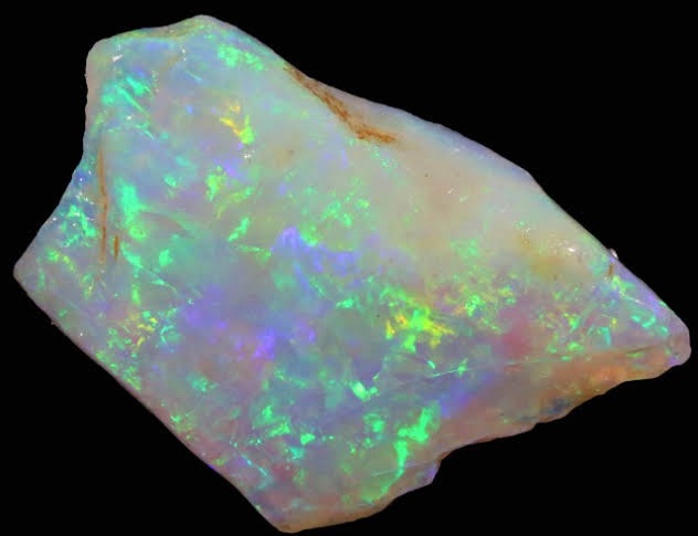 At a microscopic level opal is made of tiny spheres. In precious opal, the spheres are arranged in tightly packed, ordered three-dimensional arrays. When white light hits the spheres and the spaces between them, it is diffracted back as visible colour.