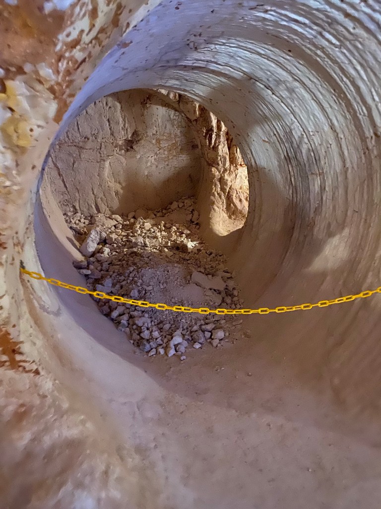 The first thing is to sink a shaft. Using machinery nowadays or by hand in the olden days. Sinking a hole and hoping to find an Opal seam. This therefore means sinking a shaft takes time and lots of inspection between depths.